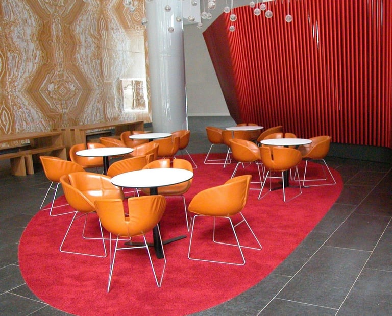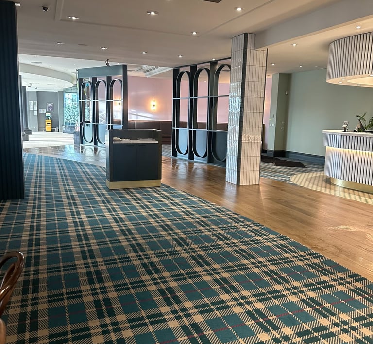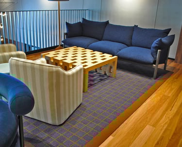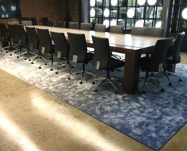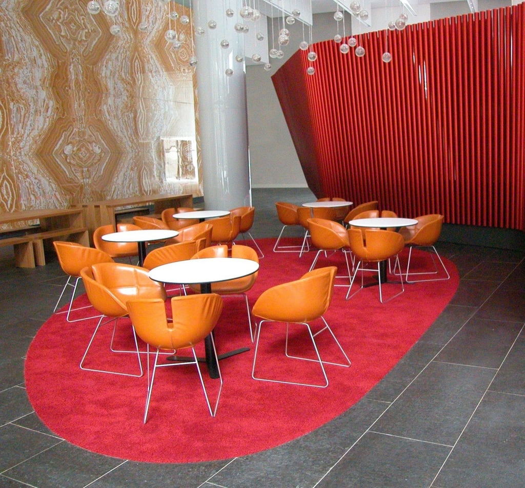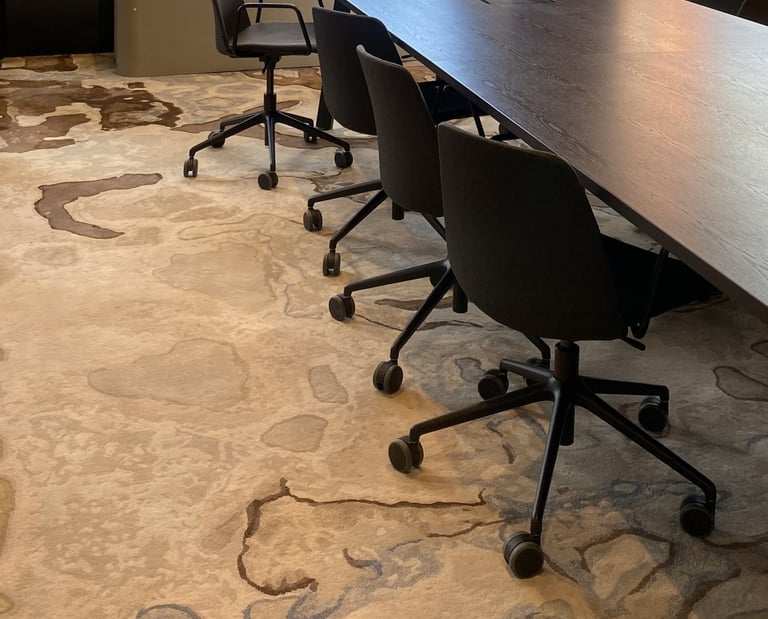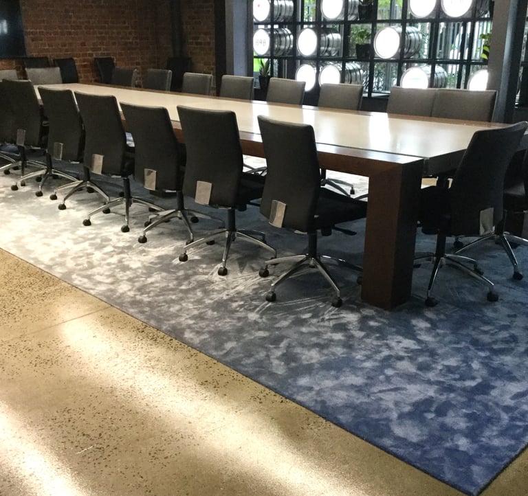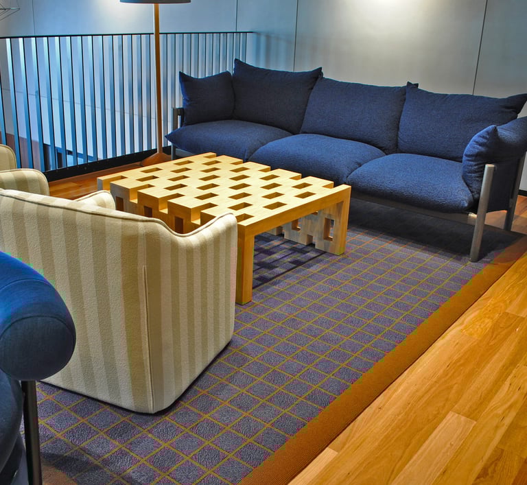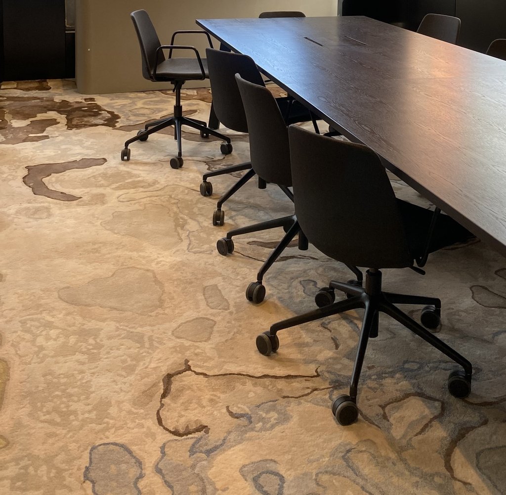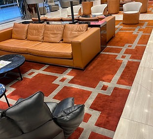 Design / Manufacture, 2 large 100% wool rectangular inset lobby rugs, evoking a restful refined space.