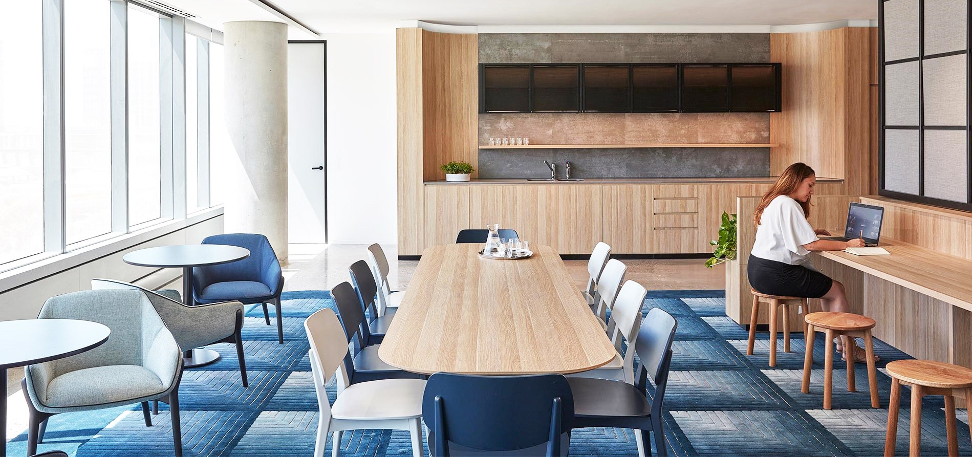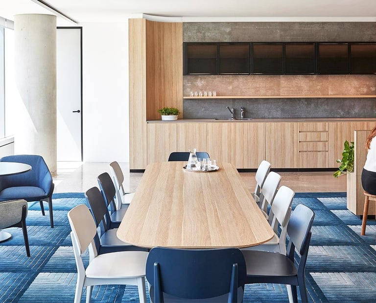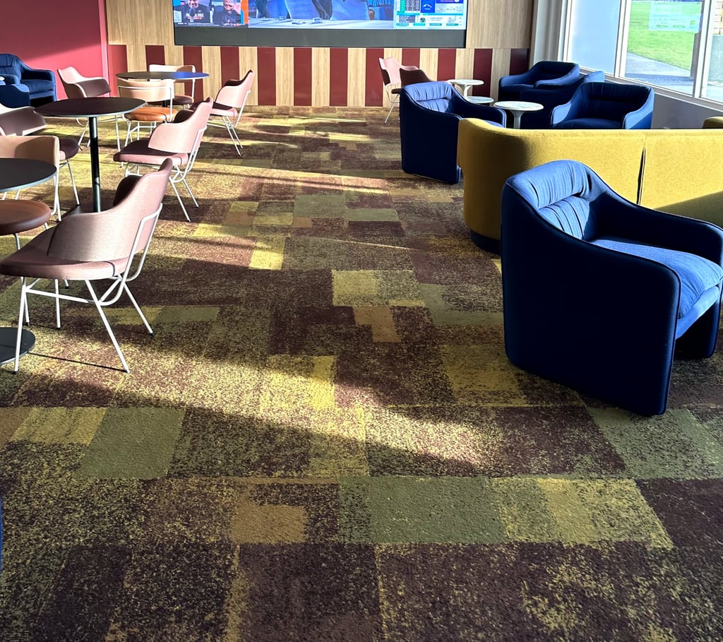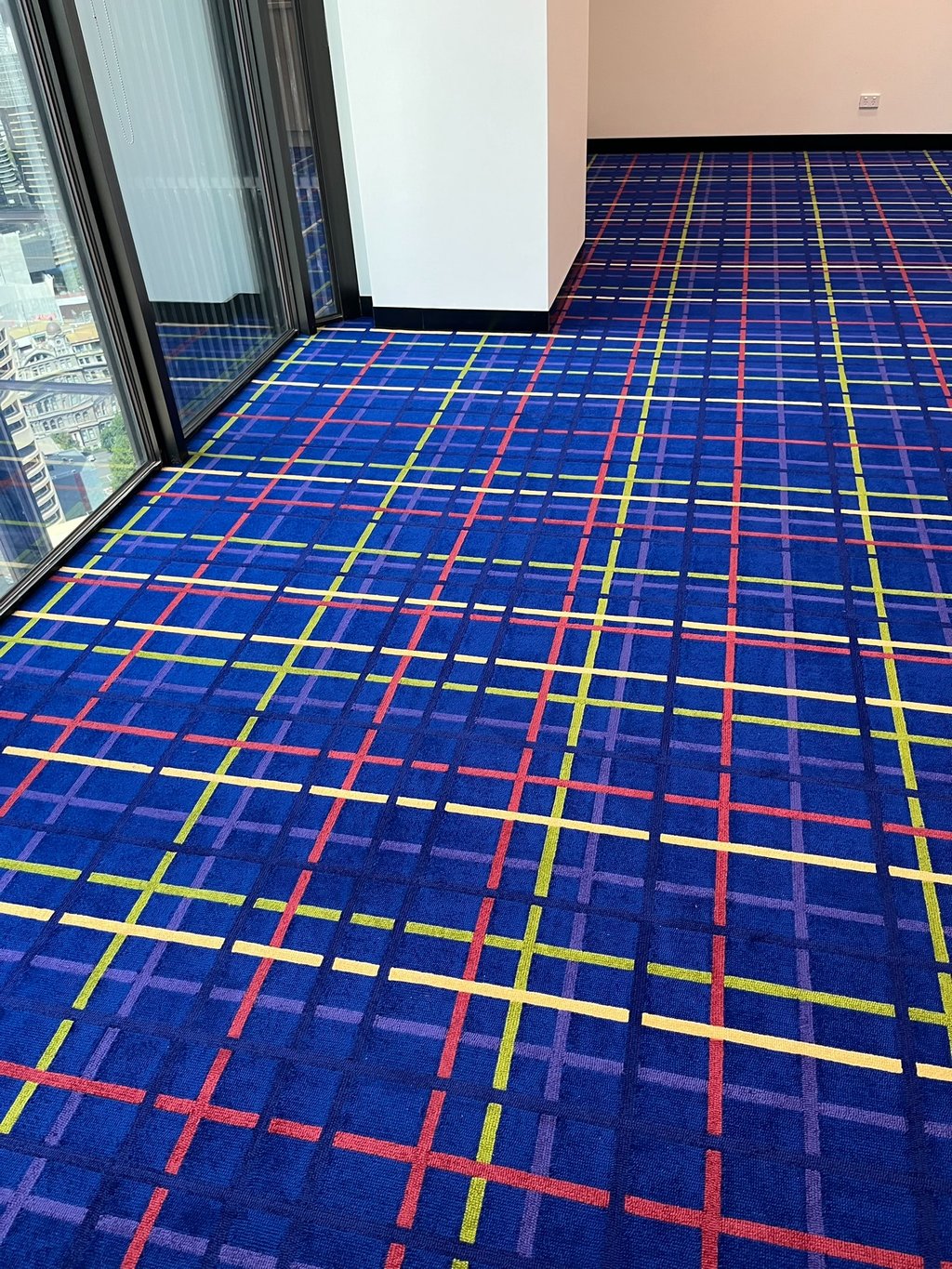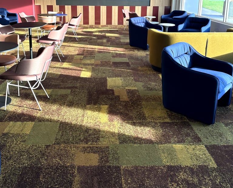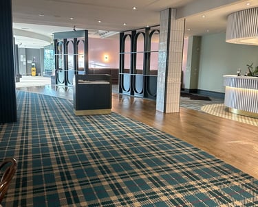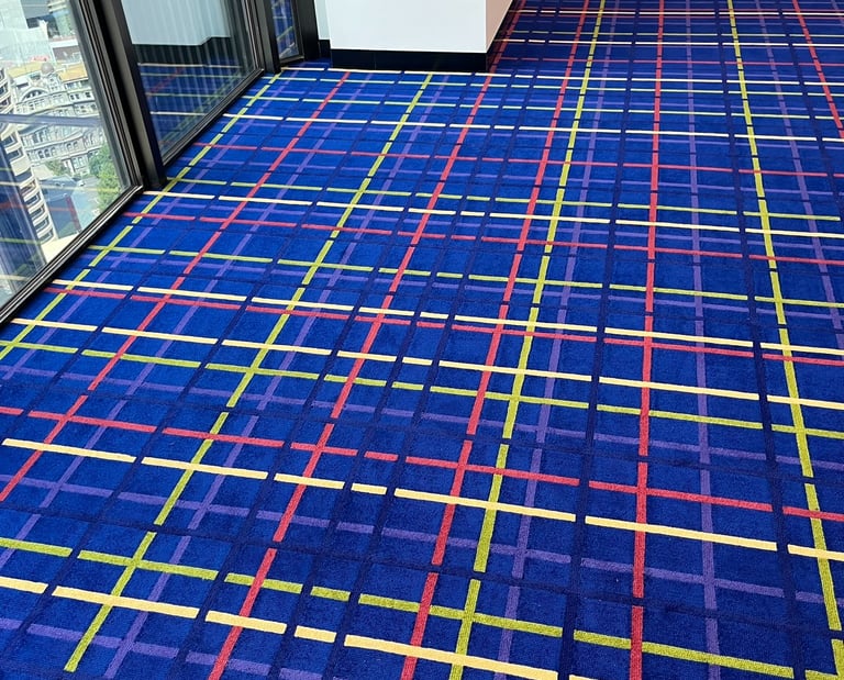 Design / Manufacture, 2 large 100% wool rectangular inset lobby rugs, evoking a restful refined space.