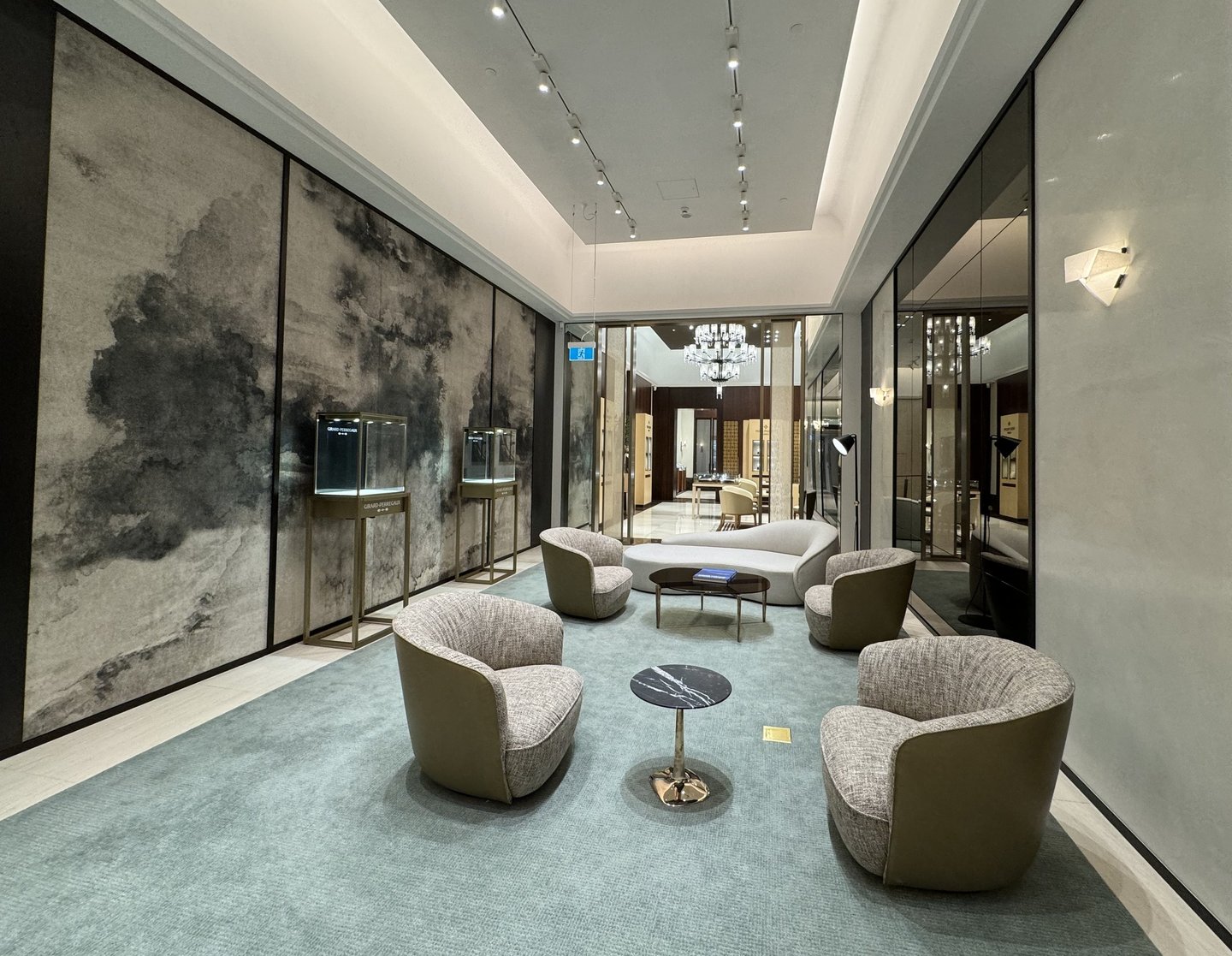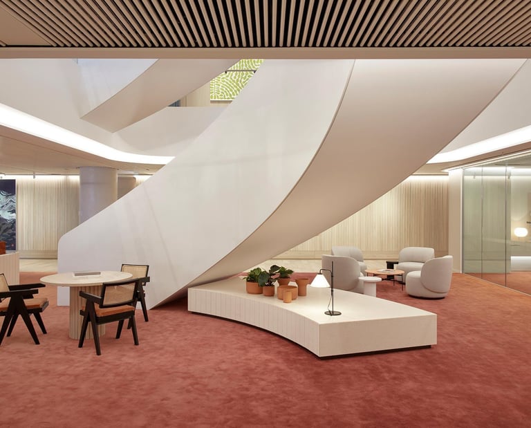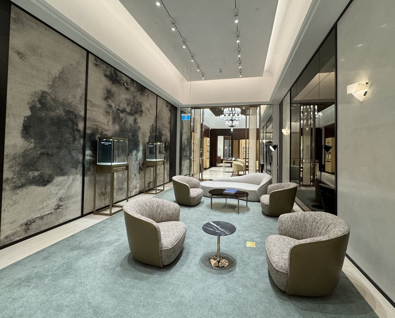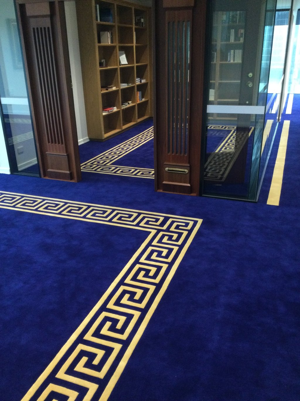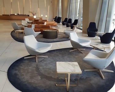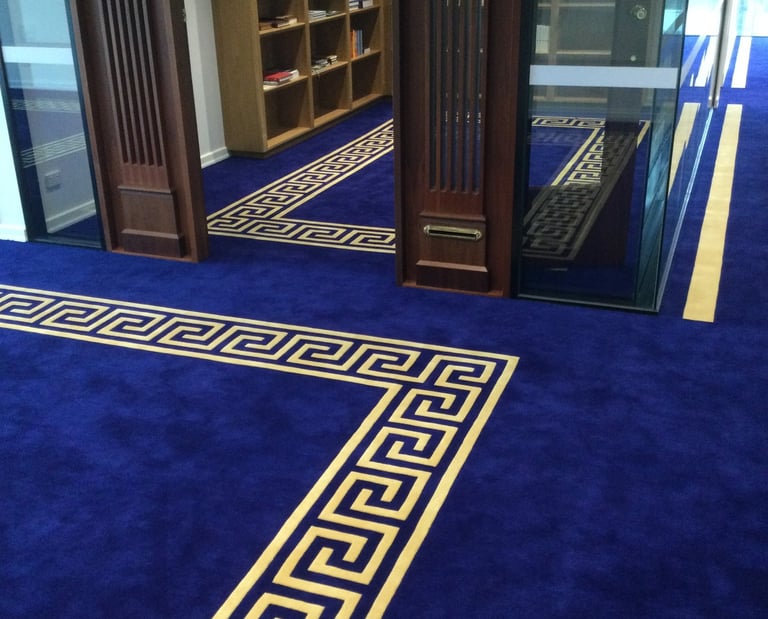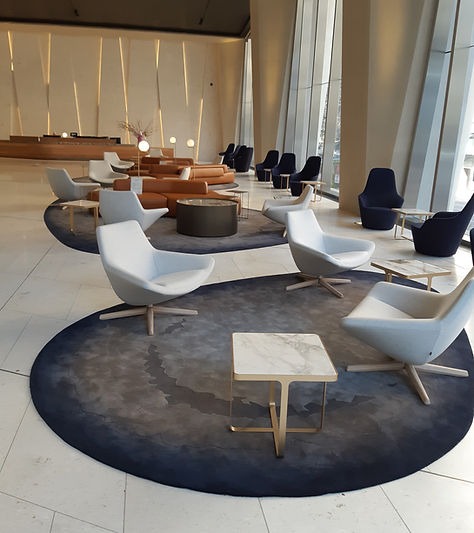 Develop Hachem design concept into a sophisticated Axminster and printed carpet with hand tufted custom rugs in private lounge and raised dais.