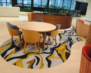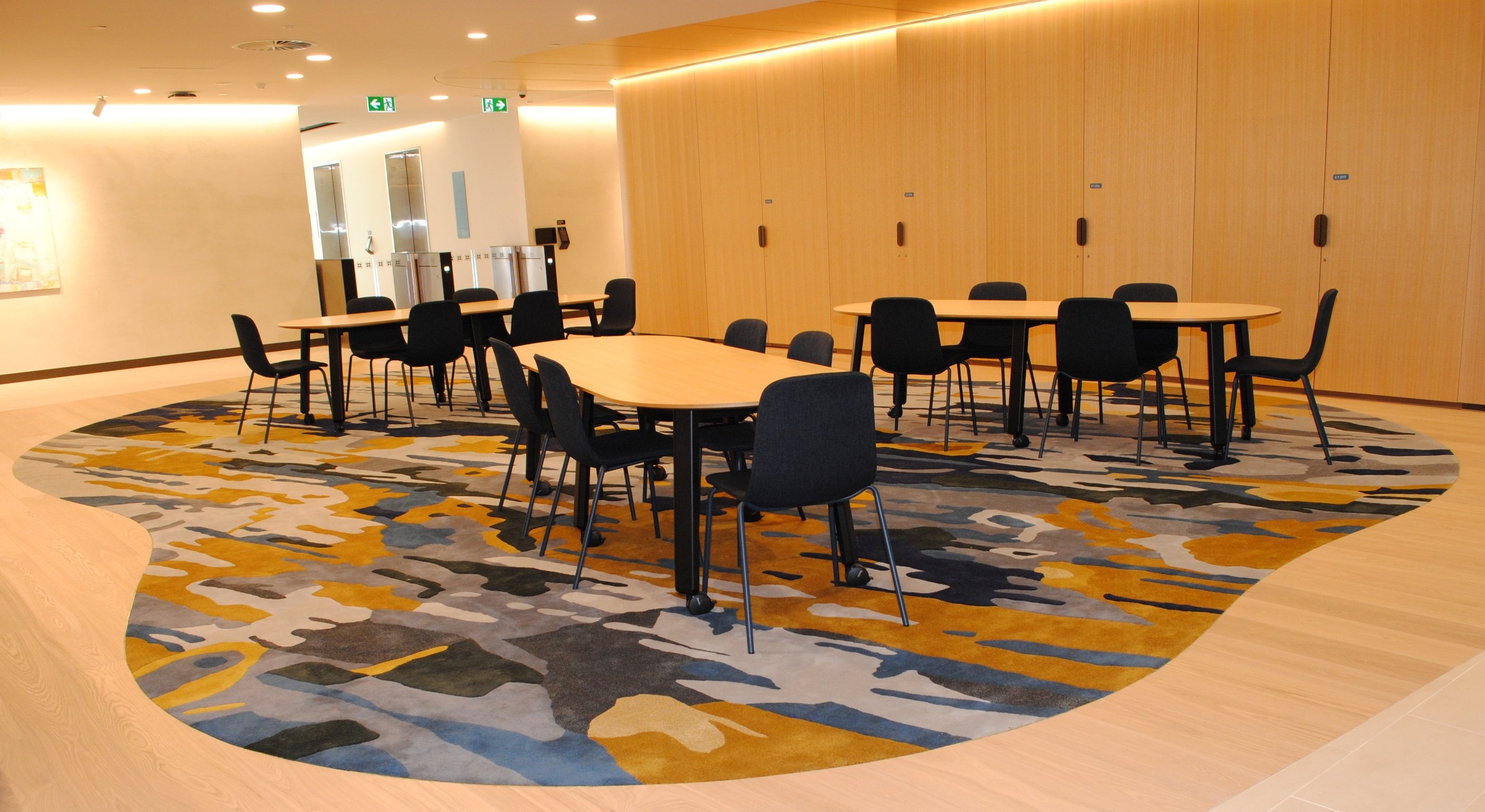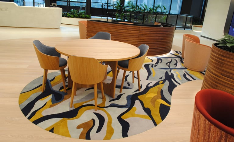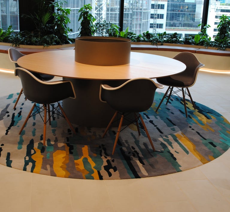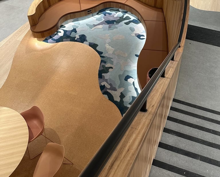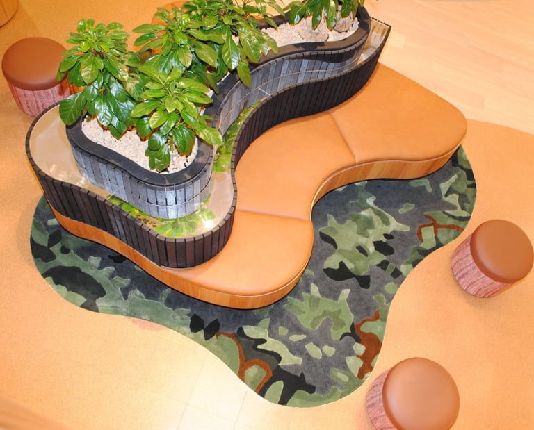 Design / Manufacture a series of 12 abstract rugs that complimented each other, creating meeting and mediative spaces within the bright airy interior. The 100% wool rugs displayed varying pile heights with carved features, conforming to organic shapes and furniture pieces.