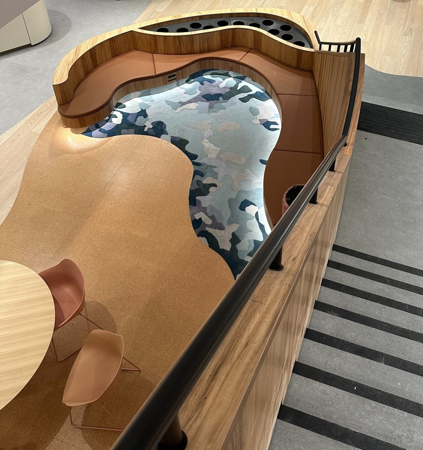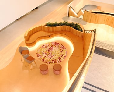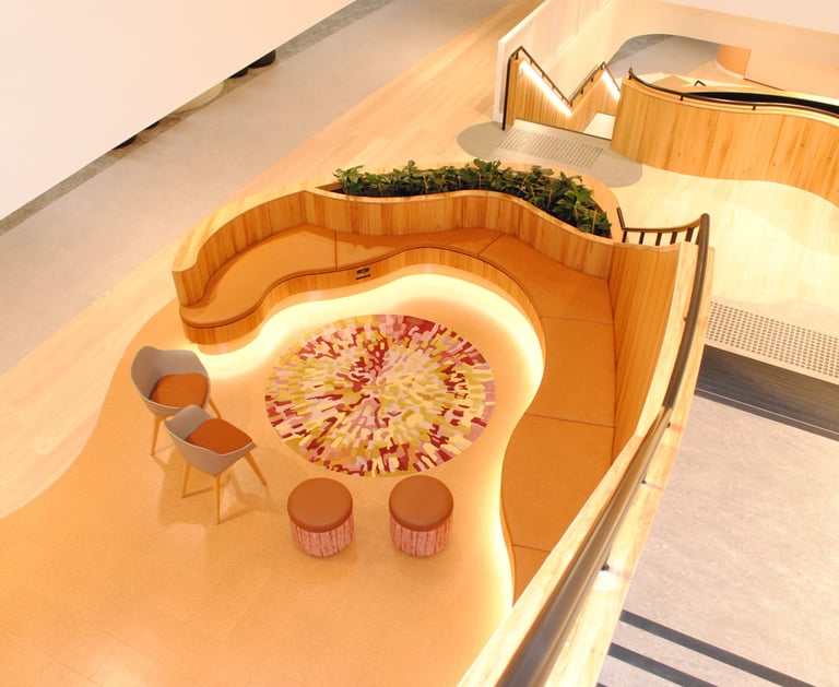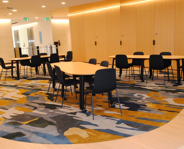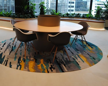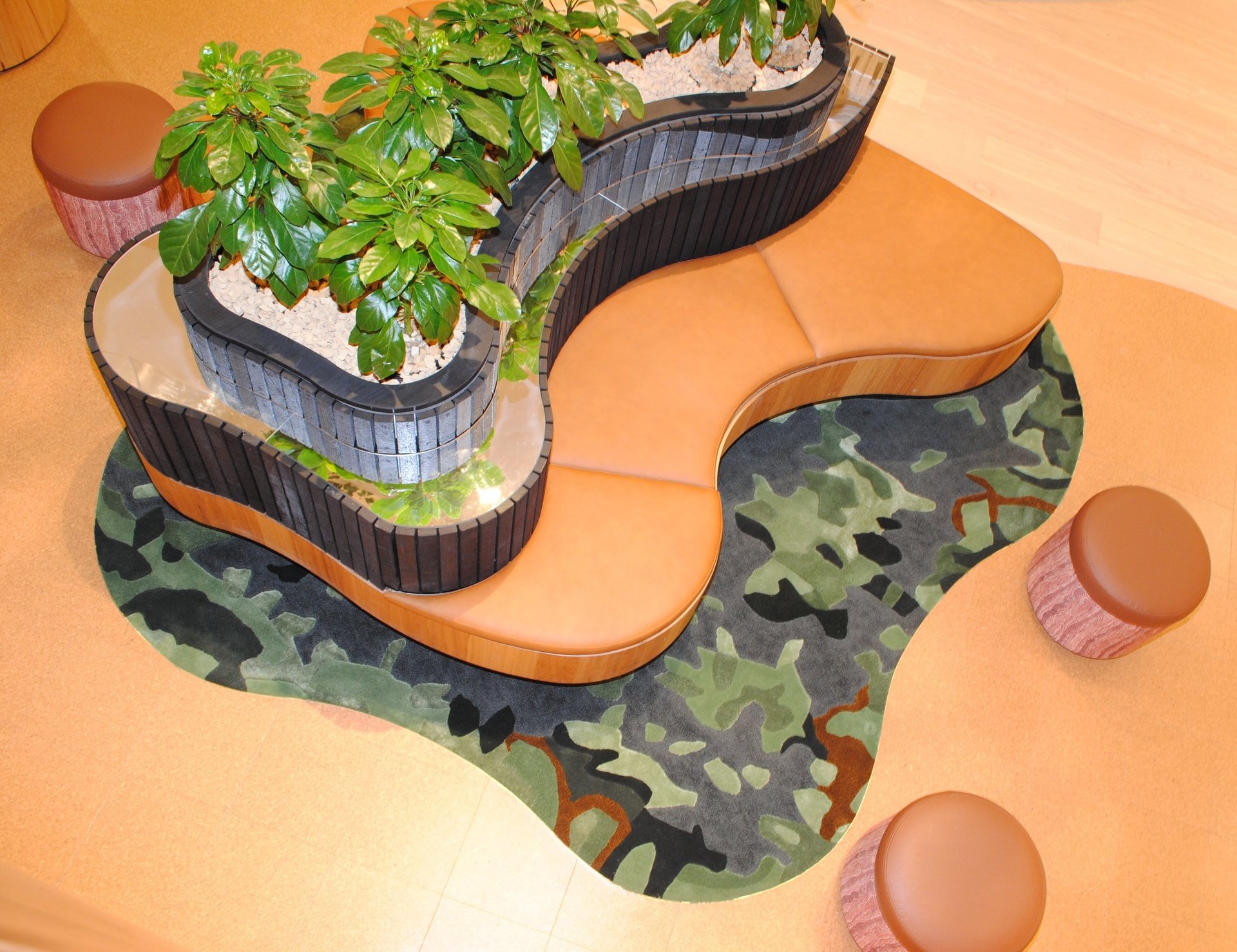 Design / Manufacture a series of 12 abstract rugs that complimented each other, creating meeting and mediative spaces within the bright airy interior. The 100% wool rugs displayed varying pile heights with carved features, conforming to organic shapes and furniture pieces.